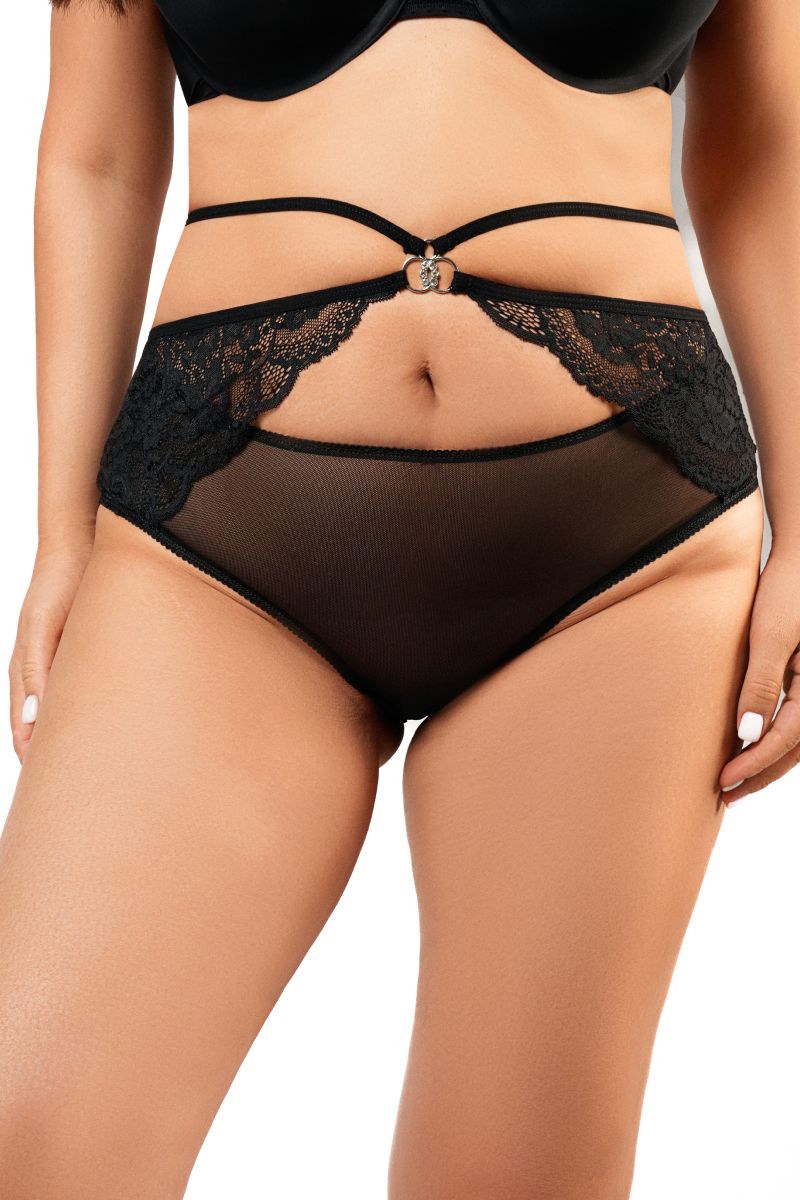 Трусики с декоративной резинкой и серебристой фурнитурой на талии, выполнены из комбинированного мягкого кружева и невесомой сеточки.