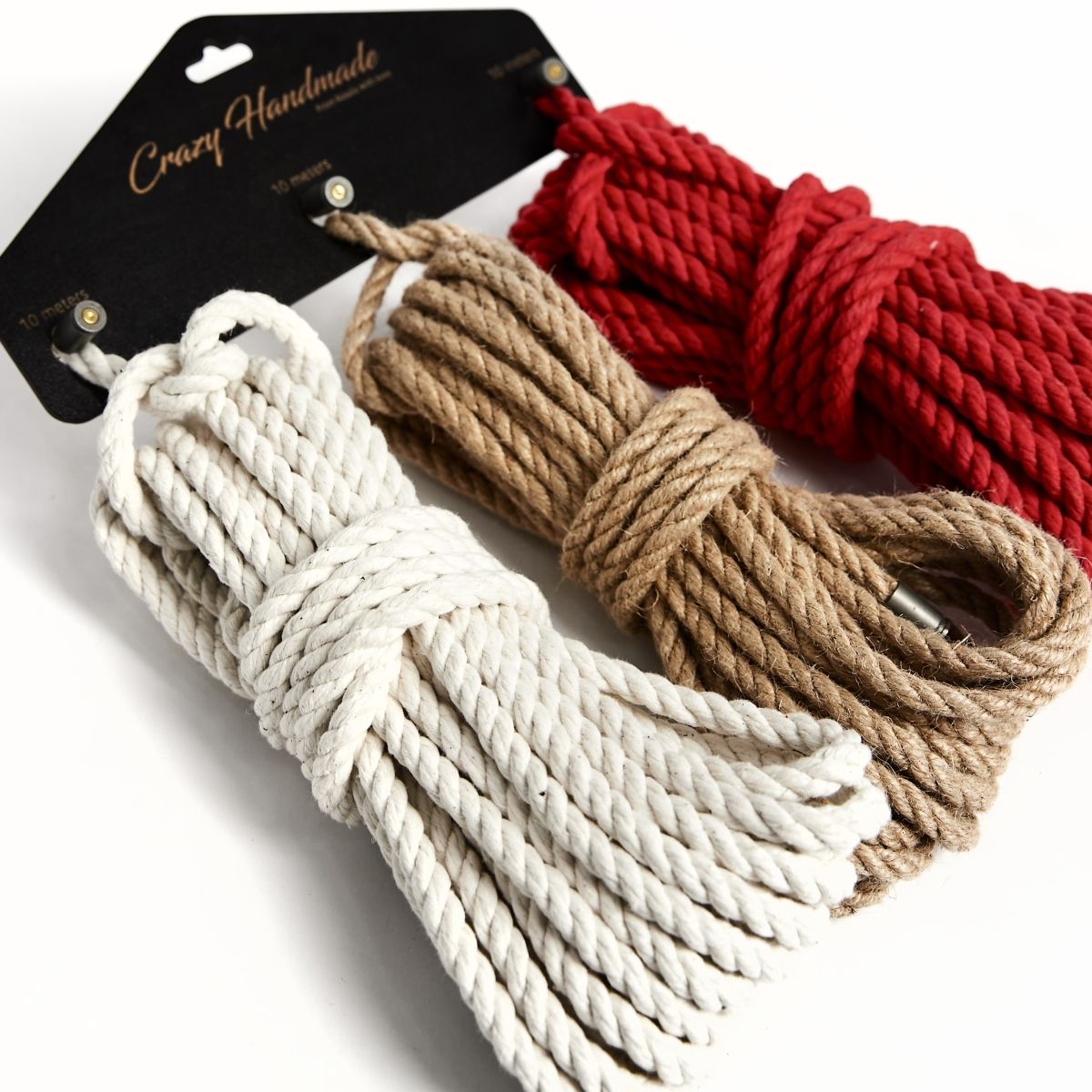 Набор из 3 разноцветных веревок для шибари (белая и красная из хлопка, коричневая из джута).
