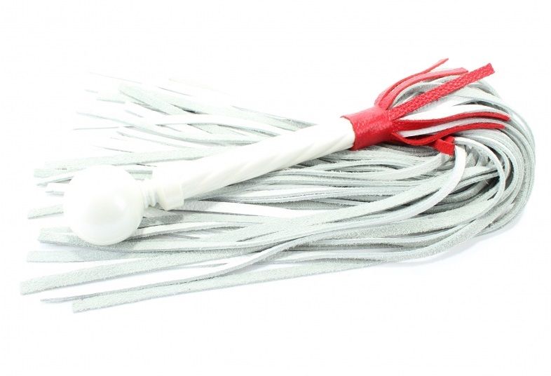 Роскошная плеть из белой кожи, имеет 40 длинных хвостов. Металлическая витая ручка украшена белоснежным шаром. Контрастная отделка ярко красного цвета. Длина хвостов - 39 см.