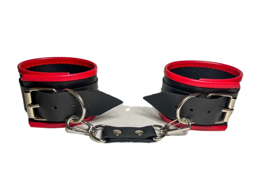 Красивые и функциональные наручники, выполненные из искусственной кожи. Декорированы металлической фурнитурой и красными вставками по краям. Обхват удобно регулируется с помощью пряжек. В комплекте идет соединение с карабинами. Очень экономичный, экологичный и практически незаменимый аксессуар для вашей любовной игры! Ширина - 5,5 см. Длина соединения - 11 см.