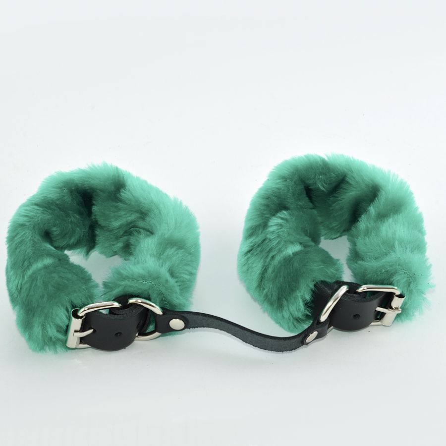Ремешки наручников изготовлены из натуральной кожи и декорированы съемным искусственным мехом зеленого цвета.