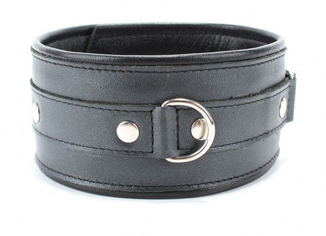 Черный кожаный ошейник с декоративными кнопками. Имеет D-кольцо для карабина. Имеет 5 отверстий для регулировки размера. Ширина - 5,5 см.