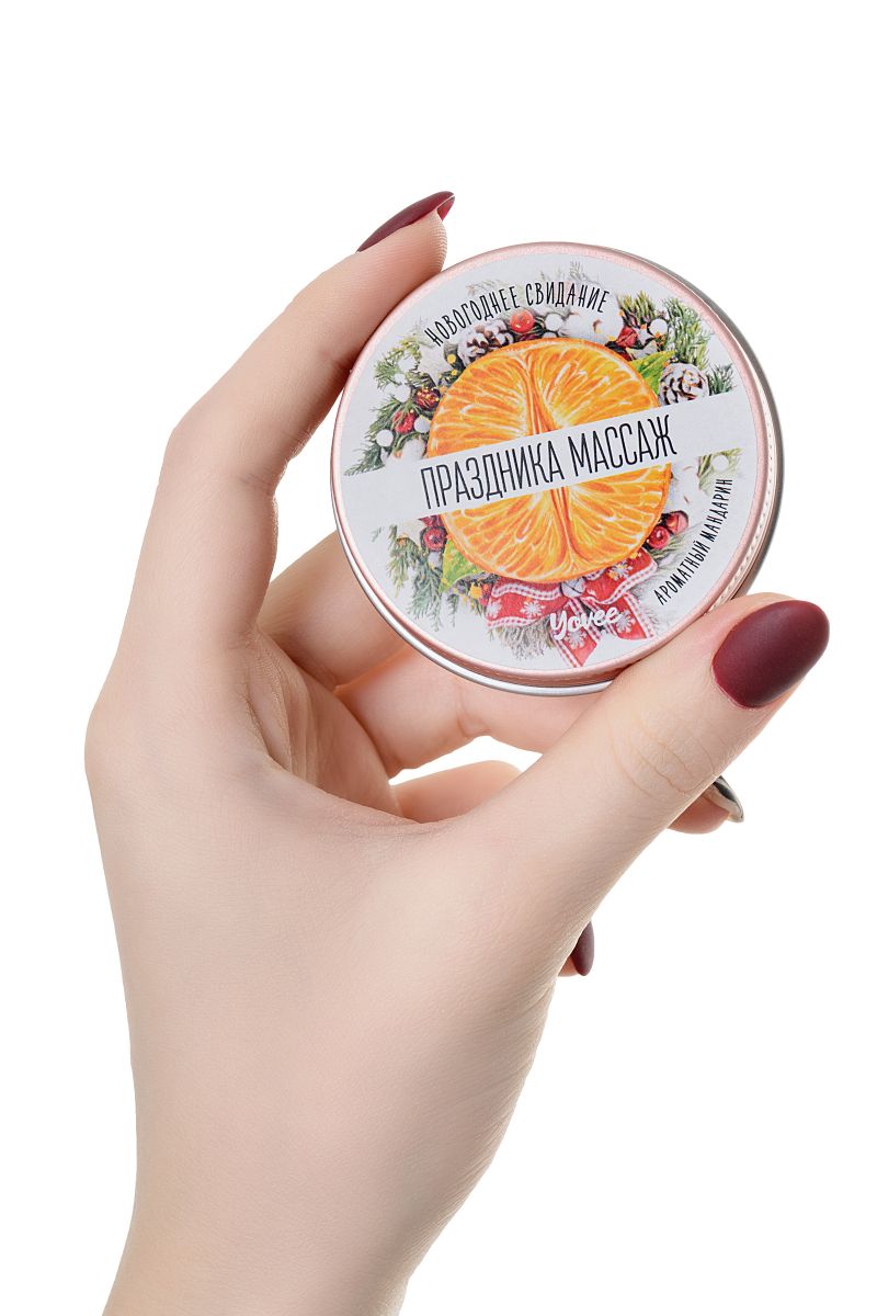 Массажная свеча «Праздника массаж». Натуральные масла в составе глубоко питают и увлажняют кожу. Растаявший воск превращается в масло для массажа. Свеча станет идеальным аксессуаром для романтического свидания. Идея для новогоднего свидания: предложите партнёру праздничный массаж. Зажгите свечу и ощутите приятный аромат. Предложите партнёру расслабиться в ожидании массажа. Затушите свечу и немного подождите, пока масло остынет. Лейте масло вдоль спины медленно, а затем начните с лёгких массирующих движений. Сделайте массаж своим обнажённым телом — так он станет ещё более интимным и чувственным. Такое свидание останется в памяти надолго! Свеча подарит незабываемые ощущения, после которых вам гарантированы нежные и мягкие прикосновения! Наслаждайтесь ароматом и бархатной кожей!