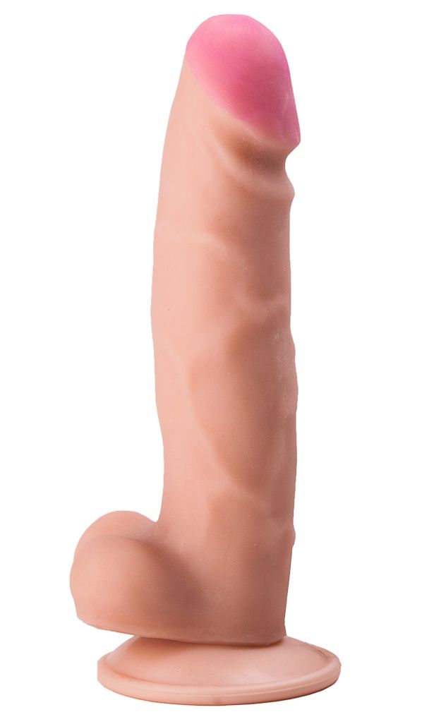 Телесный фаллоимитатор на присоске с выраженным рельефом.